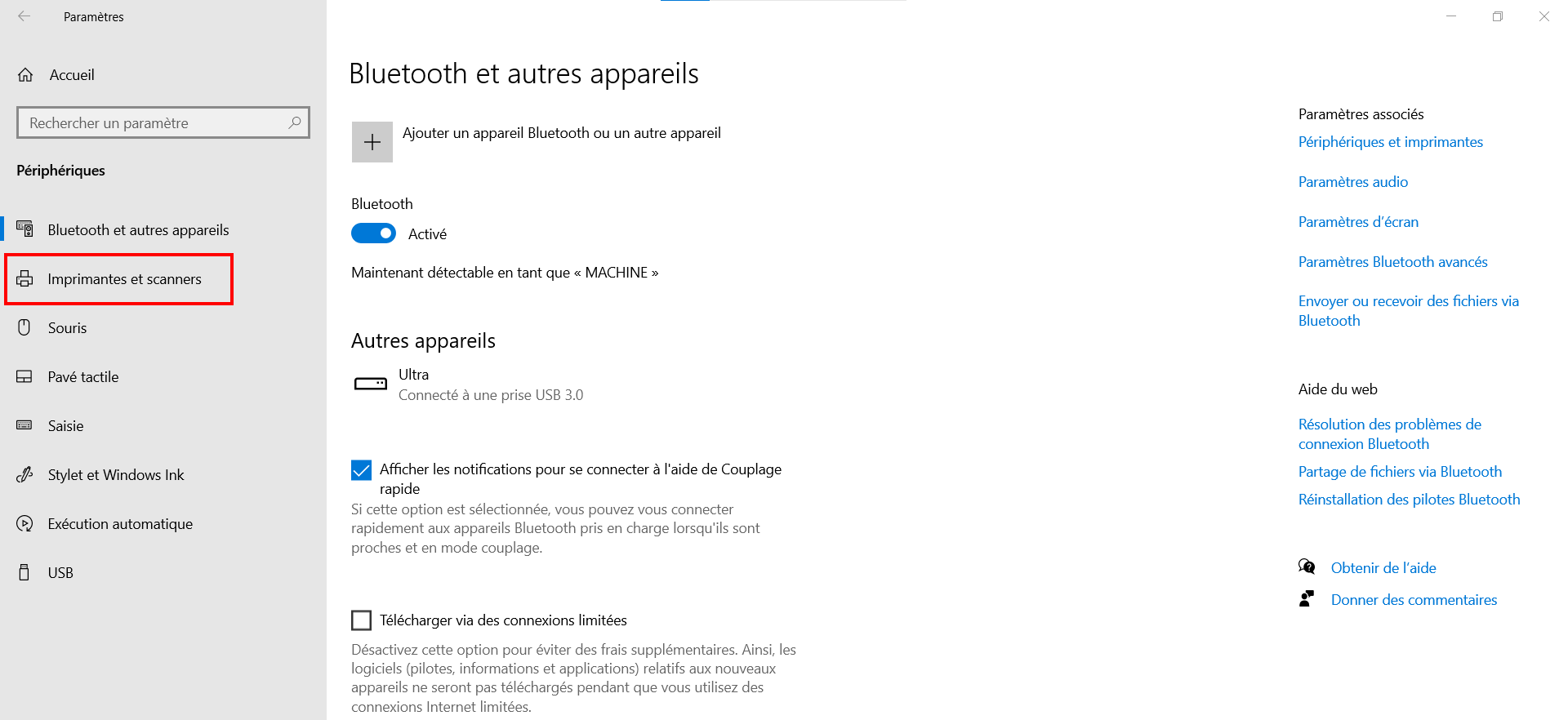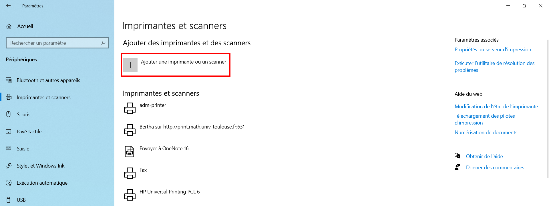 Se rendre dans les Paramètres, dans la catégorie Imprimantes : cliquer tous en bas sur "Paramètres d'imprimante supplémentaires".