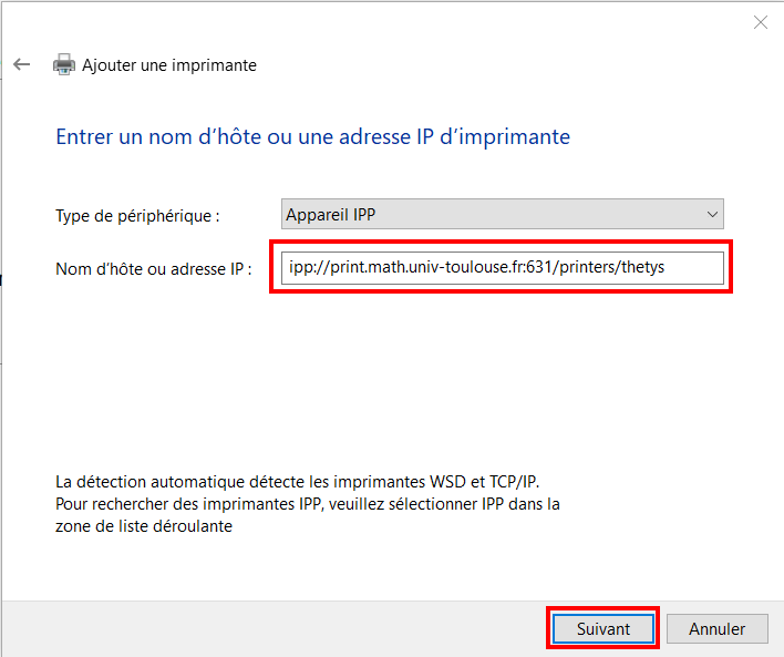 Entrez l'ULR de l'imprimante qui a comme base ipp://print.math.univ-toulouse.fr:631/printers/