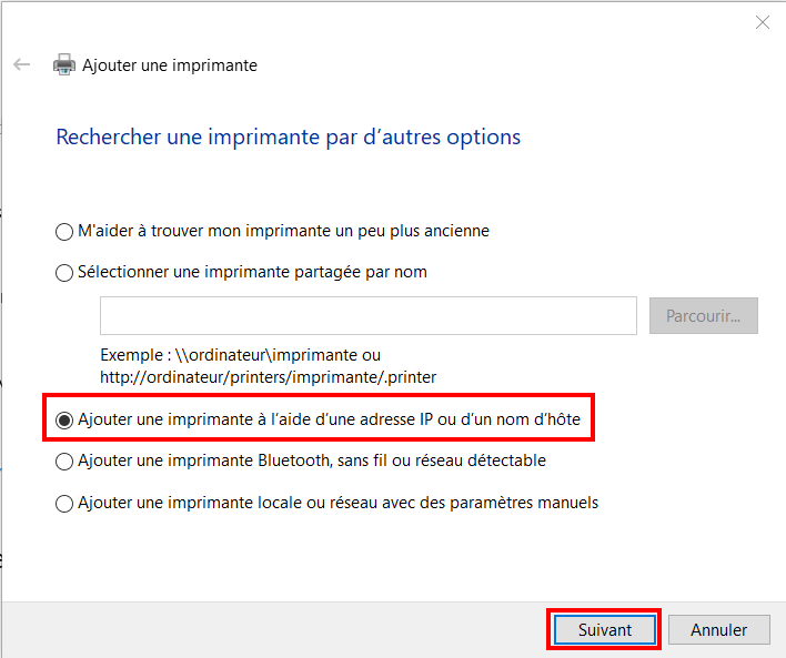 Cochez la case "Ajouter une imprimante à l'aide d'une IP ou d'un nom d'hôte"