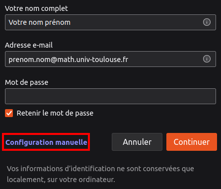 Une fois votre nom et adresse mail rentrés, cliquez sur "Configuration manuelle" pour avoir le menu de configuration du serveur entrant et sortant.